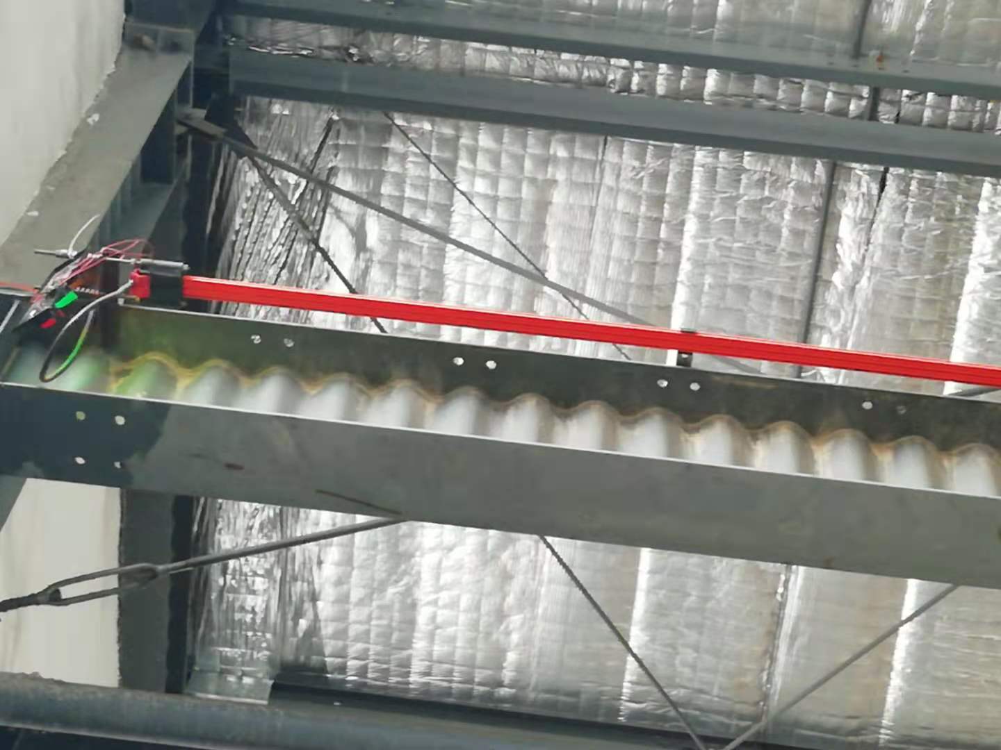 上圖是起重機主梁上帶動電動葫蘆的移動供電拖纜滑道,滑道上采用扁電纜線,耐用。